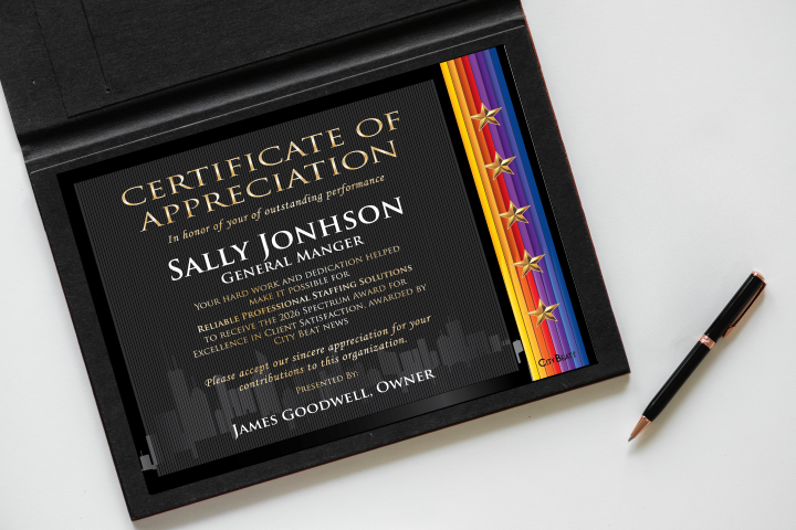 Show your top performers how much you appreciate their contributions to your organization with a personalized Certificate of Appreciation endorsed by you, your organization, and The Spectrum Awards. They are so elegant, employees will want to display their award proudly. Our Appreciation Certificates can be customized to meet your specifications. You will receive a form via email to complete your customized order.